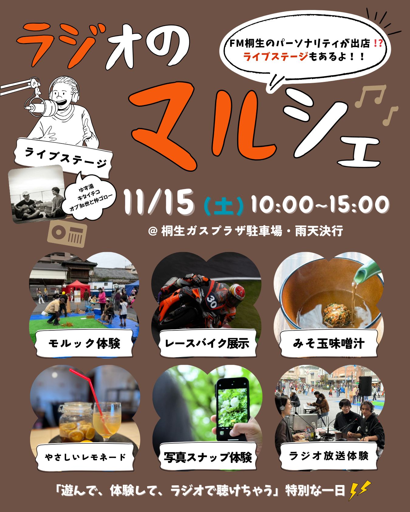 2025年10月19日 日曜日 午前10時から午後4時まで、 桐生ガスプラザの駐車場を会場に、 FM桐生が主催する「ラジオのマルシェ 」を開催します!