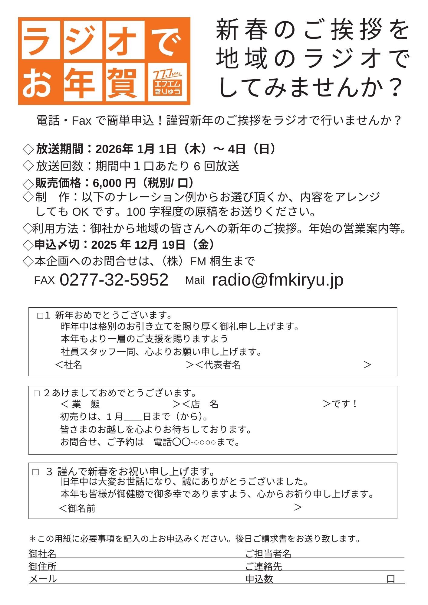 ご不明な点は、株式会社FM桐生 電話:0277-22-3339 までお問い合わせ下さい。