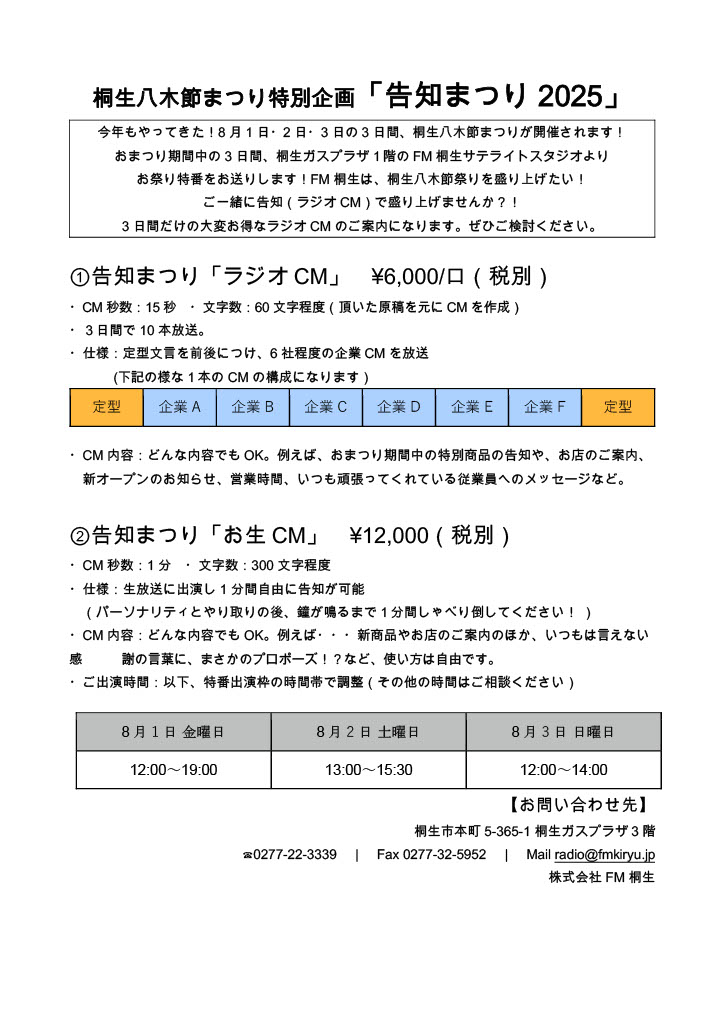 ご不明な点は、株式会社FM桐生 電話:0277-22-3339 までお問い合わせ下さい。
