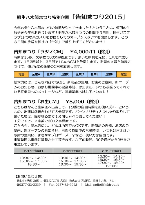 ご不明な点は、株式会社FM桐生 電話:0277-22-3339 までお問い合わせ下さい。