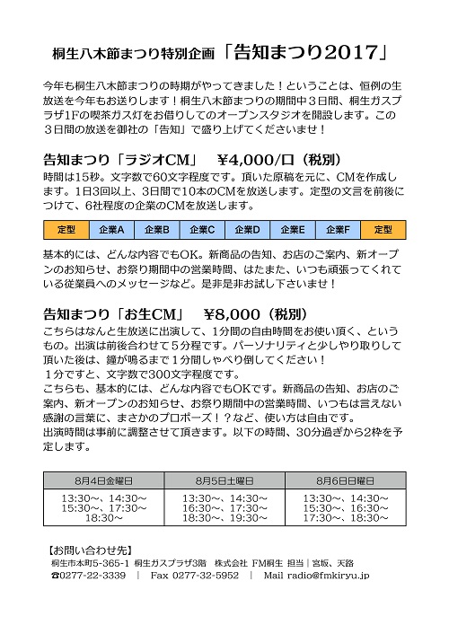 ご不明な点は、株式会社FM桐生 電話:0277-22-3339 までお問い合わせ下さい。